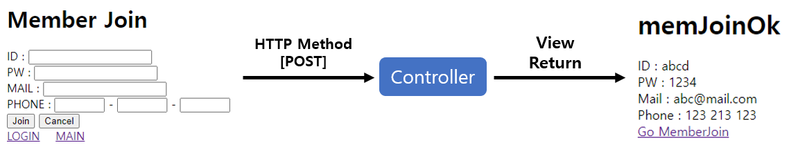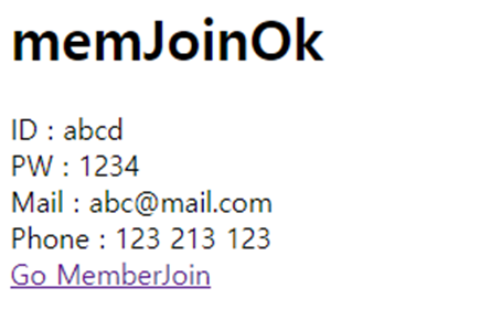 HttpServletRequest를 이용해 회원가입시 작성된 값들을 불러와 service, dao 단에서 회원가입을 처리한 뒤, model 객체를 활용해 view단에 request 받은 값들을 넘겨준다.