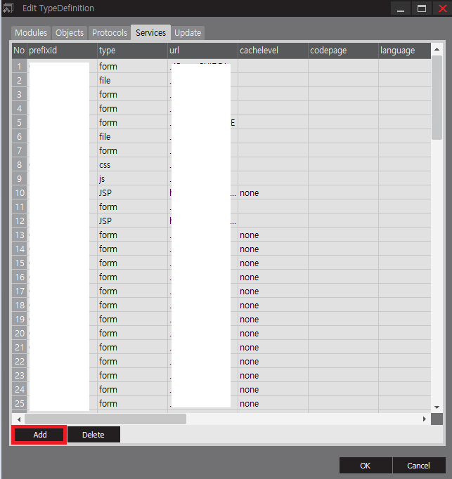 TypeDefinition을 더블클릭 하면 창이 뜨는데, Services 탭으로 이동해 Add 버튼으로 새로운 Service를 추가해줄 수 있다.