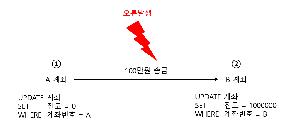 이 때 A계좌의 UPDATE 쿼리가 실행된 후 예상치못한 오류가 발생한다면 A계좌의 데이터(100만원)는 사라지게된다.