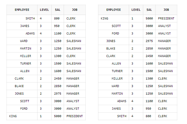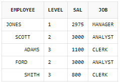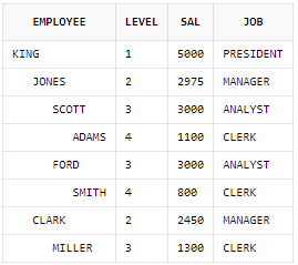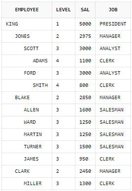 START WITH와 CONNECT BY 절을 이용하면 LEVEL을 출력할 수 있다. START WITH절은 루트노드를 지정하며 CONNECT BY 절은 부모노드와 자식노드 간의 관계를 지정한다.