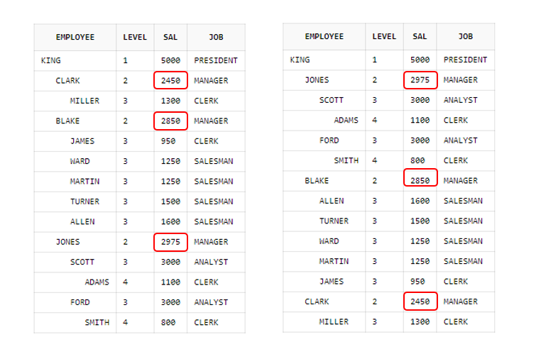 [Oracle] 계층형 질의 (START WITH, CONNECT BY) 예제 ORDER SIBLINGS BY, ORDER BY 차이