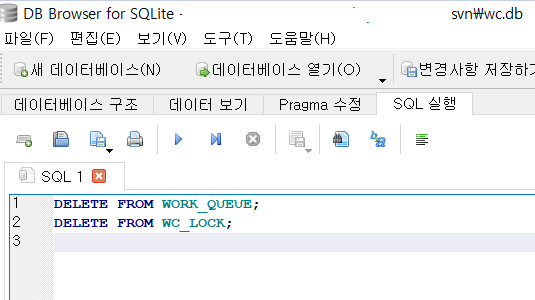 파일 > 데이터베이스 열기 > 프로젝트의 workspace 폴더 > .svn > wc.db