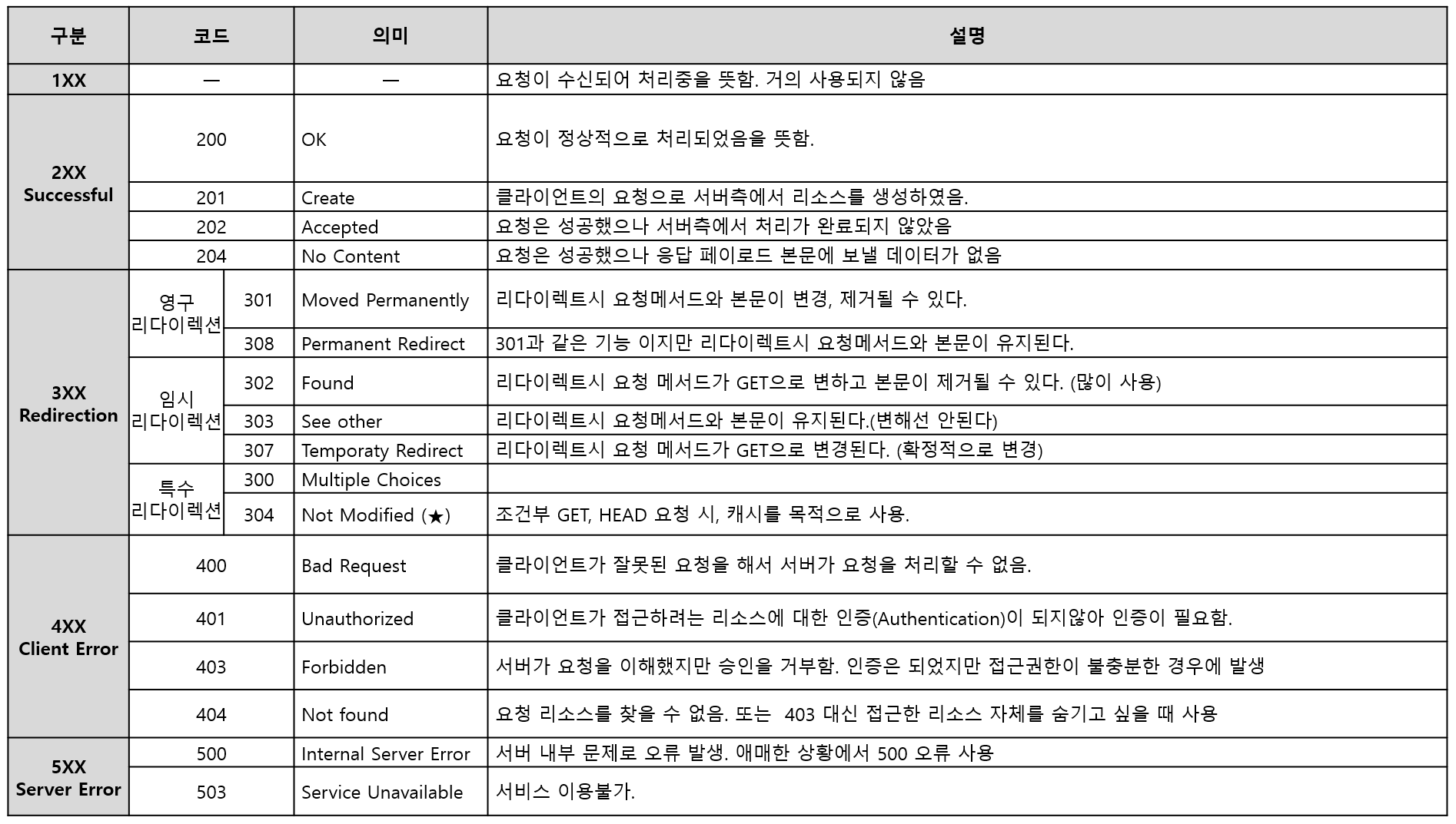 304 Not Modified(★) : 조건부 GET, HEAD 요청시, 캐시를 목적으로 사용된다. 클라이언트에게 리소스가 수정되지 않았음을 알려준다.(=캐시가 만료되지 않았음을). 클라이언트는 로컬에 저장된 캐시를 재사용한다.(=캐시로 리다이렉트 한다)