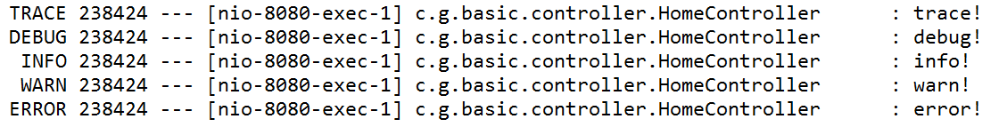 로그는 기본적으로 info 가 지정되어있으며 info(기본값) 이하의 로그메세지는 출력하지 않는다. 그래서 모든 로그를 알고싶다면 application.properties에 다음과 같이 추가해준다. 그 이후 실행하면 모든 로그가 출력된다.