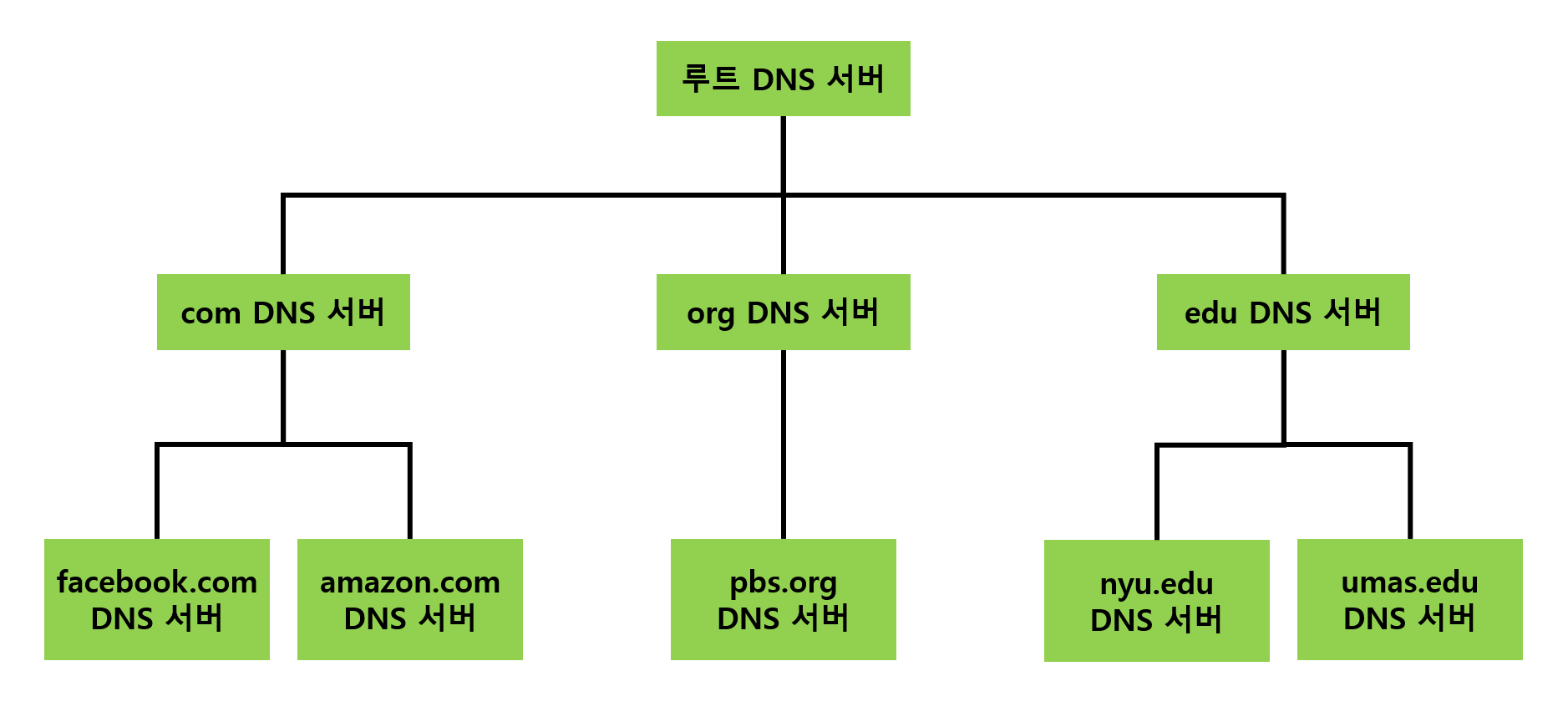 • TLD DNS 서버 : com, org, edu 같은 상위레벨 도메인 또는 kr, uk, fr 같은 모든 국가 코드 상위 도메인이 포함된다.