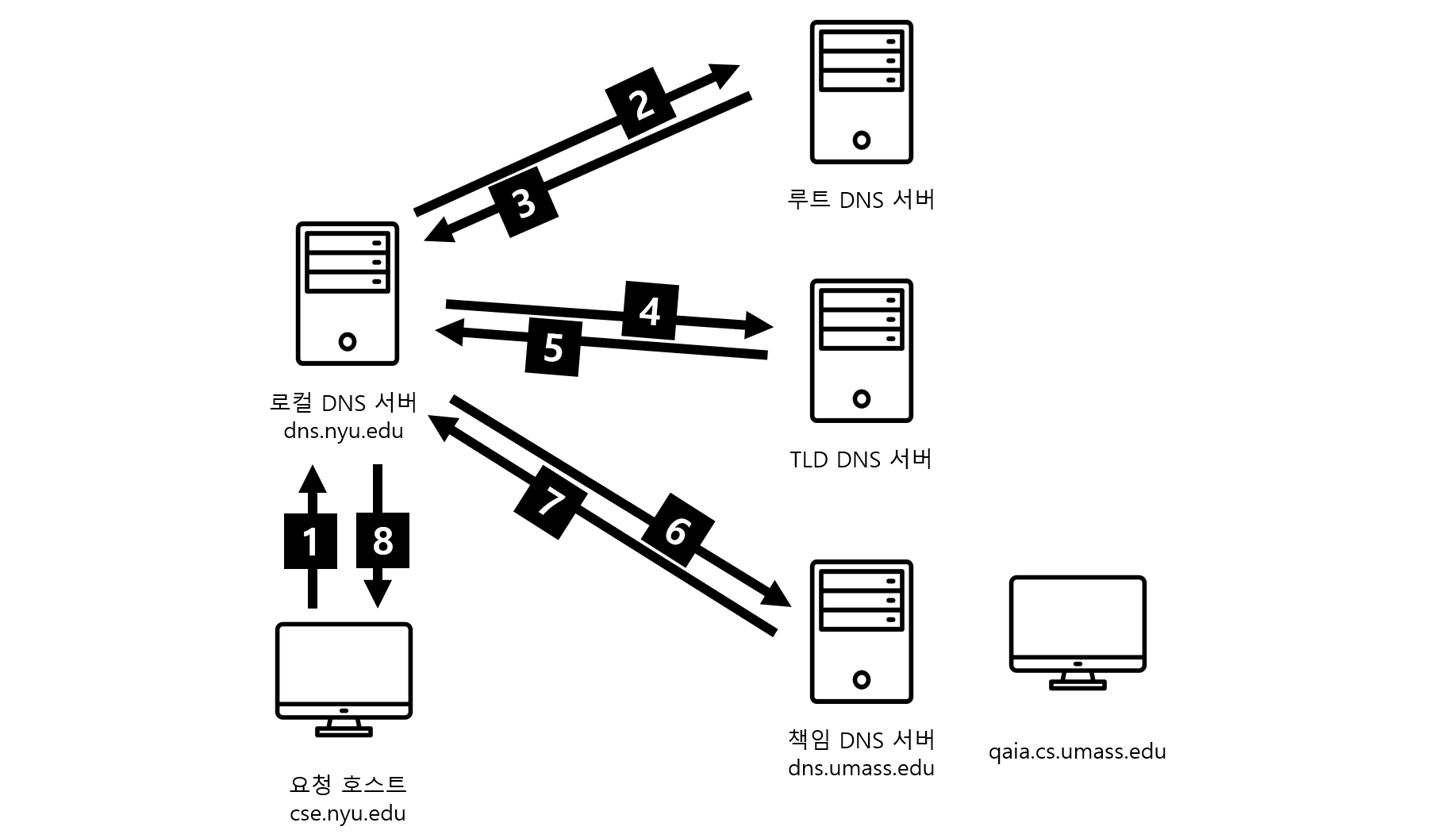 1. 호스트는 cse.nyu.edu 를 자신의 로컬 DNS 서버(dns.nyu.edu)에 질의를 보낸다. 질의에는 변환되어야하는 도메인네임(gaia.cs.umass.edu)이 포함되어있다.