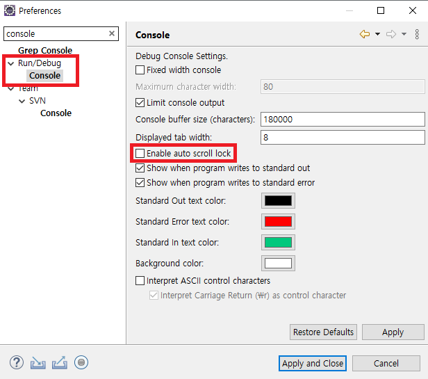 이클립스 콘솔창에서 우클릭 > Preferences 로 바로 해당창을 띄울 수도 있다.