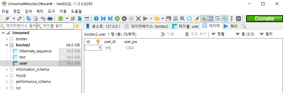 user 테이블의 [데이터] 탭으로 이동 후 새로고침(F5)을 하면 방금 입력한 정보를 확인할 수 있다.