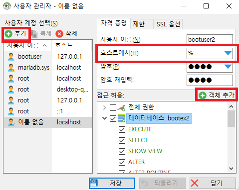 [사용자 인증 및 권한관리] - [추가] - [호스트에서 : 모든 곳에서 접근] - [객체 추가 : bootex2] - [저장]