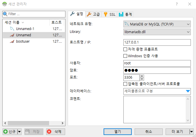 HeidiSQL을 실행하면 설치과정에서 입력한 root 계정과 패스워드를 통해 접속한다. (최초 실행 시 좌측 세션 리스트는 화면과 다를 것이다. 상관없다)