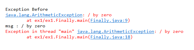 Exception에서 주의할 점은 try 에 존재하는 에러코드 이후의 명령어들은 실행되지 않는다는 것이다. 그렇게 되면 꼭 실행해야 할 명령어들이 실행되지 못하고 넘어가버리는 경우가 생길지도 모른다. 이 때 finally 를 이용하면 try문에서 문제가 발생하더라도 사용자가 실행하고싶은 명령어들을 실행할 수 있게된다.