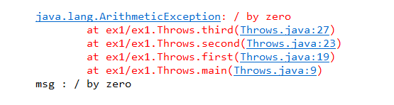 throws Exception 은 자기 자신을 호출한 메소드에게 오류처리를 넘겨주는 것이다. 예제는 first() -> second -> third() 순으로 호출을 하였고 third()메소드에서는 정수를 0으로 나누는 오류를 범하였다. 하지만 이 오류에 대한 예외처리는 third()메소드가 아닌 second()메소드에게 넘어가고 second 또한 throws Exceprion을 하였으니 first()메소드에게 까지 오류에 대한 예외처리를 넘기게 된다.