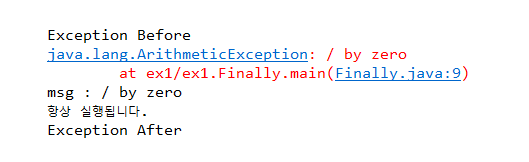 System.out.println("Exception After");//프로그램이 종료되지 않고 실행된다.